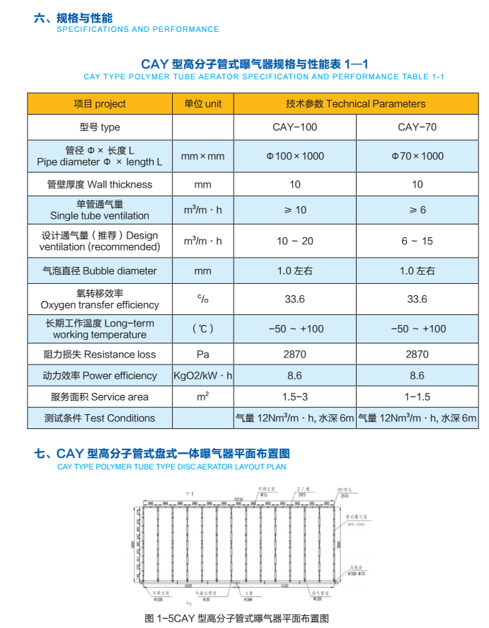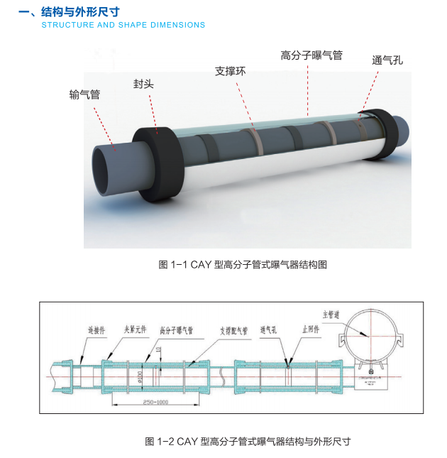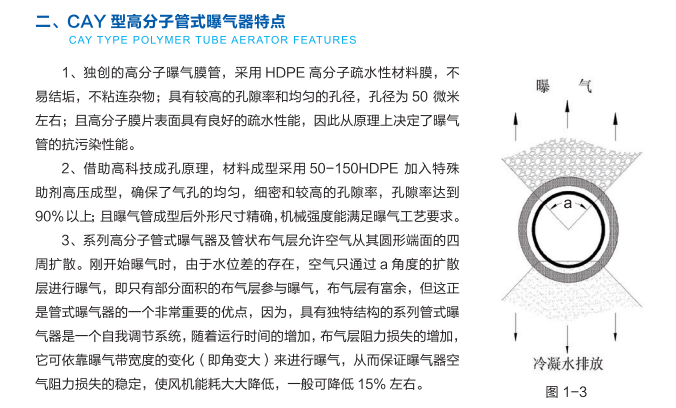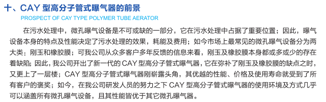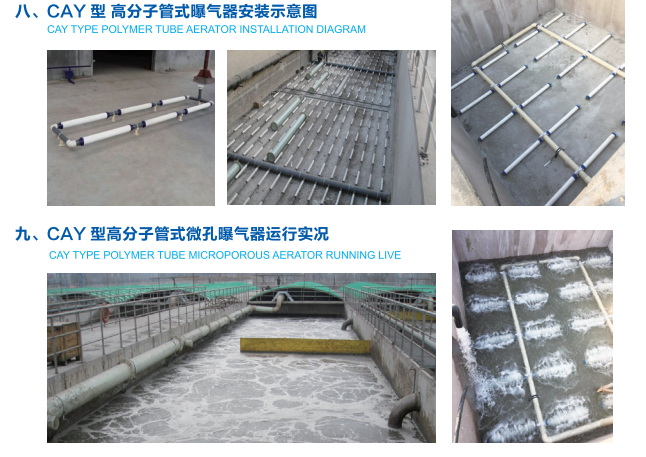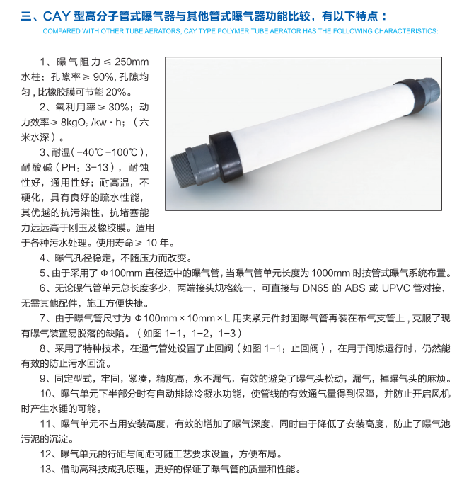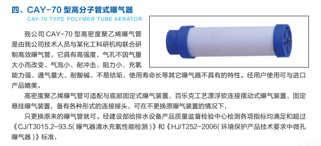 本公司产品是按照国家CJ/T264-2007《水处理用膜橡胶膜微孔曝气器》新标准,引进化工科研机构的成果,生产出的新一代CAY型高分子管式曝气器。