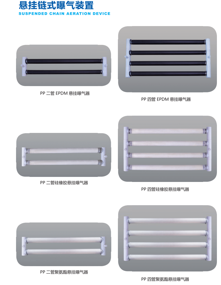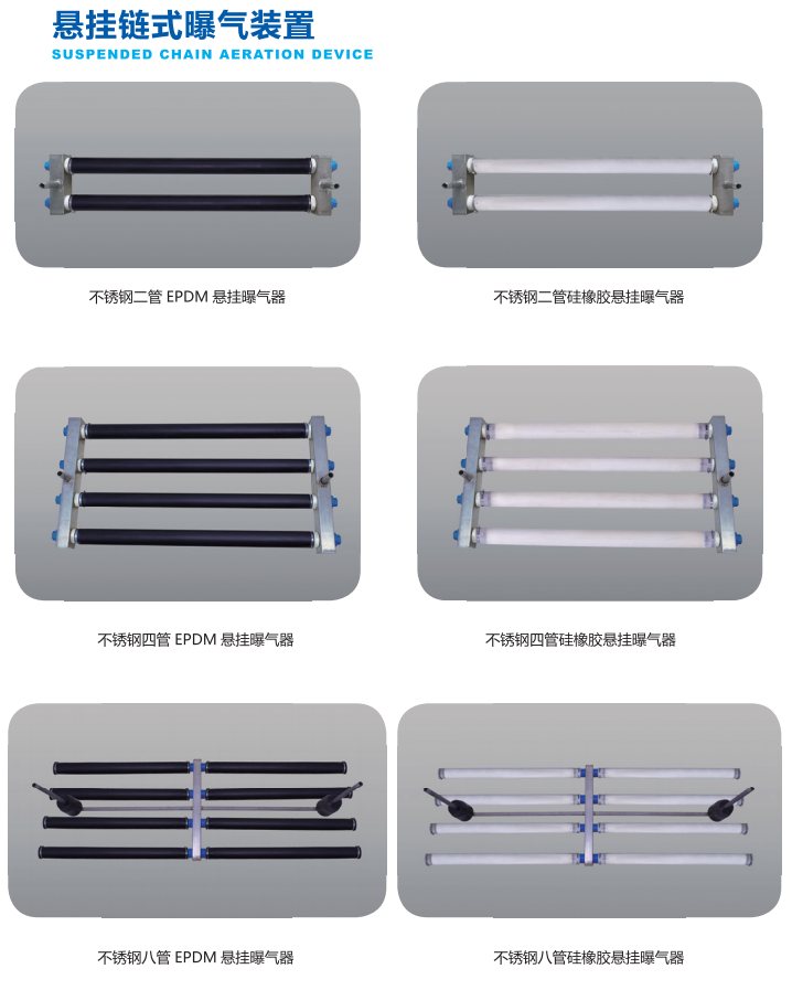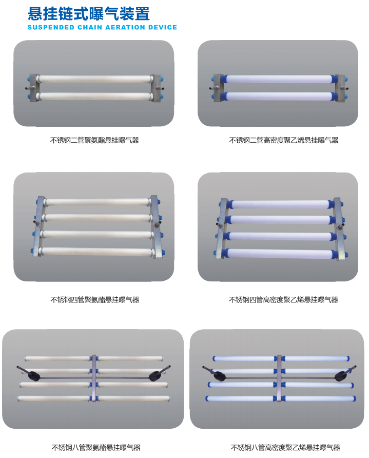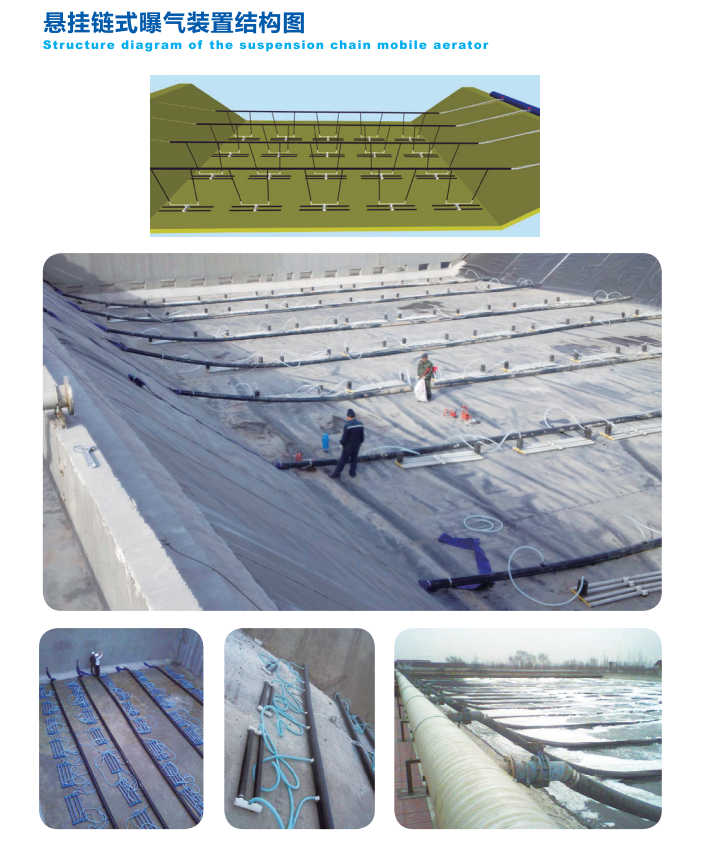 悬挂链移动曝气器是由曝气器、悬挂链、水面输氧管道三部分构成。